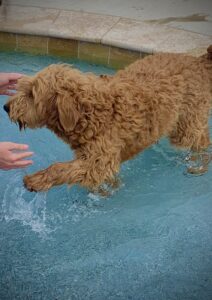 Dolly is our beautiful female F1 Mini Goldendoodle. Dolly is always wanting to be in the middle of the action – loves to play and will sit still as can be at the mere touch of her belly. Dolly is 45 lbs.