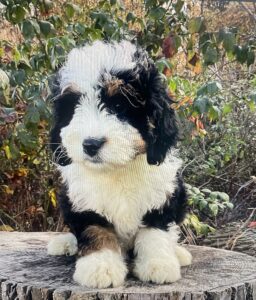 Diamond is our youngest female of the bunch. She is a F1 Bernedoodle. Her offspring will be F1B Bernedoodles. She has a stunning tricolor coat that catches everyone’s eye immediately.